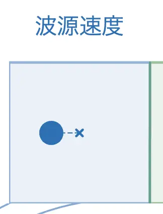 この時、波源の右側の波が左側に比べて詰まっていることがわかるでしょうか?正確にいうと、右側の方が波同士の距離 = 波長が短くなっています。