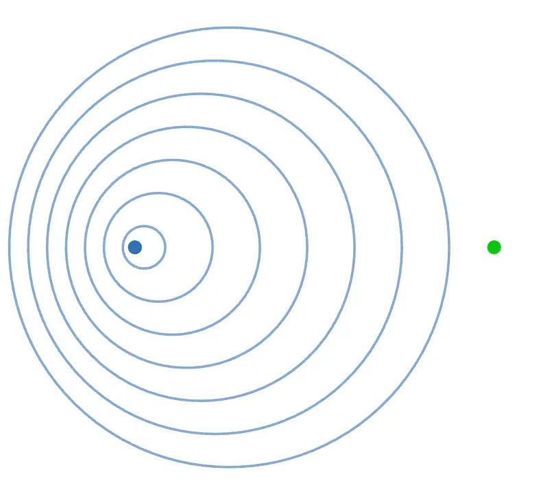 先ほどとは逆に、波源の右側の方が波同士の距離 = 波長が長くなっています。つまり、観測される周波数は低くなります。